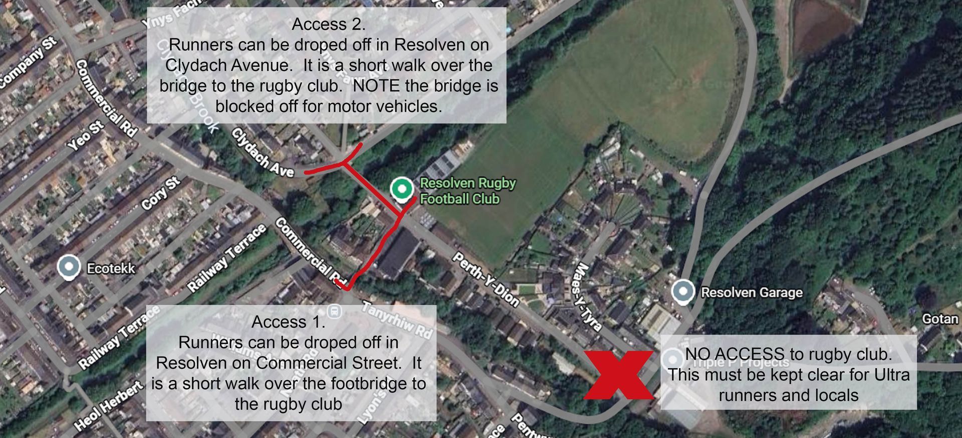 Option 2. You can get dropped off in Resolven, options for access are shown below. This option is only for runners whose supporters are not staying. NOTE - DO NOT park in the residential streets in Resolven, please respect the local community.
